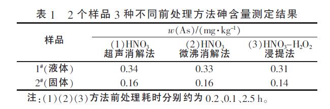 文獻(xiàn)采用HNO3-H2O2浸提2h,試液定容1000mL再分取一定量試液上機(jī)測試,砷濃度被稀釋導(dǎo)致樣品中目標(biāo)物未檢出;定容后加入濃鹽酸及還原劑,給測量結(jié)果引入新的誤差。實(shí)驗(yàn)采用3種前處理方法均為進(jìn)一步減小試液定容體積(100mL),依次加入濃鹽酸及還原劑后再用水稀釋至刻度。采用3種前處理方法測定了2個(gè)代表性樣品(液體和固體)的砷含量,結(jié)果見表1。
