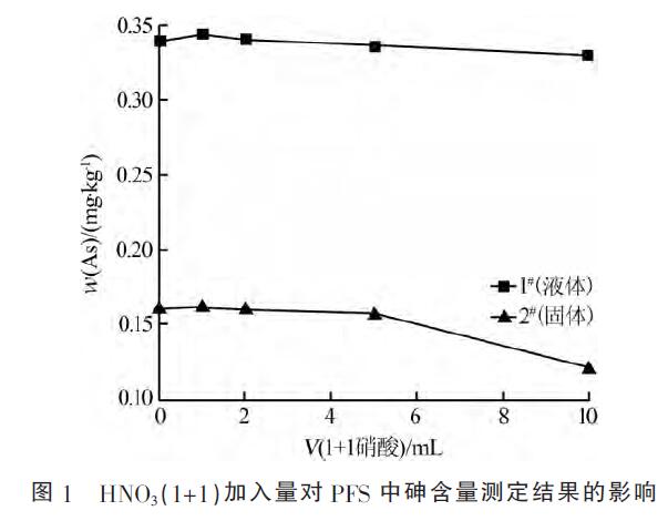 3種前處理方法得到的測定結(jié)果無明顯差異,方法(3)結(jié)果略低。考慮實(shí)驗(yàn)耗時(shí)、分析效率、實(shí)驗(yàn)成本等因素,方法(1)采用100mL比色管直接稱樣、很聲消解、定容上機(jī),簡便快速有效,故選擇方法(1)對PFS中砷含量進(jìn)行測定。2.2HNO3溶液加入量選擇PFS遇水很易水解,加入一定量硝酸溶液能使樣品消解完全。采用方法(1)對樣品進(jìn)行前處理,考察了加入不同體積的HNO3(1+1)對砷含量測定結(jié)果的影響,結(jié)果見圖1。加入1mLHNO3(1+1)時(shí)可滿足試樣完全消解的要求。