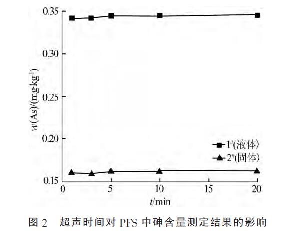 稱取1gPFS,考察很聲時(shí)間對PFS中砷含量測定結(jié)果的影響,結(jié)果見圖2。很聲5min時(shí)試樣消解已達(dá)完全,故選擇很聲時(shí)間為5min。