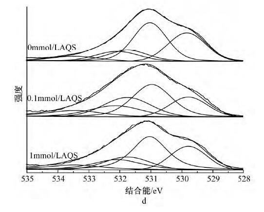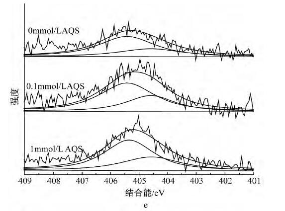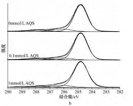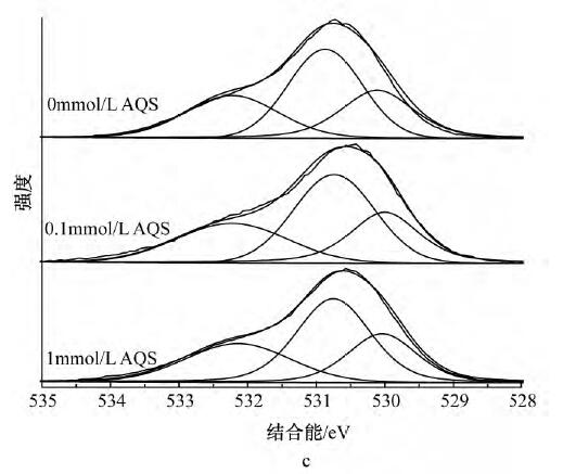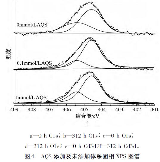 為了解AQS的存在是否影響Cd2+的吸附機理,采用XPS對體系中的C、O、Cd元素進行分析。經過XPSPeak4.1軟件分峰處理后,圖4a中C1s可擬合出3個峰,其中:284.8eV為C—C/C—H,是表面污染碳[21],286.2eV為C—OH,是MR-1菌表面的醇羥基或醚,287.7eV為C—OOH,是MR-1菌表面的羧基;表明MR-1菌體表面官能團主要為羧基和醇羥基或醚。從圖4b中C1s可以看出:反應平衡后所有體系中C—OH和C—OOH峰面積比均有所降低,說明醇羥基或醚和羧基均參與了反應,而無AQS的體系峰面積比降幅更小,推測由于體系生成的二次礦物較多,增加了溶液中Cd2+的傳質阻力,阻擋了菌體表面與溶液中游離離子的絡和。圖4cO1s中可擬合出3個峰:530.1,530.9,532.2eV分別對應絮體中的Fe-O、MR-1菌表面的羧基、醇羥基或醚。圖4dO1s中,所有體系在531.1eV處均出現新峰Fe—OH,且有AQS體系的Fe—OH峰面積比略小于無AQS體系,與XRD分析結果吻合,說明所形成的二次礦物中針鐵礦和磁鐵礦量(結晶度稍差)少于無AQS體系,且Fe—O發生了一定的位移,其中Fe—O包括未被還原絮體中的Fe—O和二次礦物中的Fe—O;另一個新峰為531.7eV處的Cd—O,且0.1mmol/LAQS峰面積比較大,原因是反應前期釋放出來的Cd2+更多,菌體表面有機官能團和二次礦物表面存在大量的羥基位點絡合了更多的Cd2+;所有體系中C—OH均發生了一定的位移,結合能均有增加,原因是C—OH中的O含有孤對電子,能與Cd共享電子從而發生配位絡合形成Cd—O,從而降低了O原子周邊的電子云密度。圖4e中Cd3d,404.59eV處為Cd—O,405.4eV處為PFS混凝Cd2+產生的峰[26]。而從圖4f中Cd3d可以看出:有AQS體系中Cd—O峰面積比無AQS體系大,與O1s圖譜中的Cd—O一致,其中Cd—O包括二次礦物和菌體表面有機官能團結合Cd2+形成的Cd—O。
