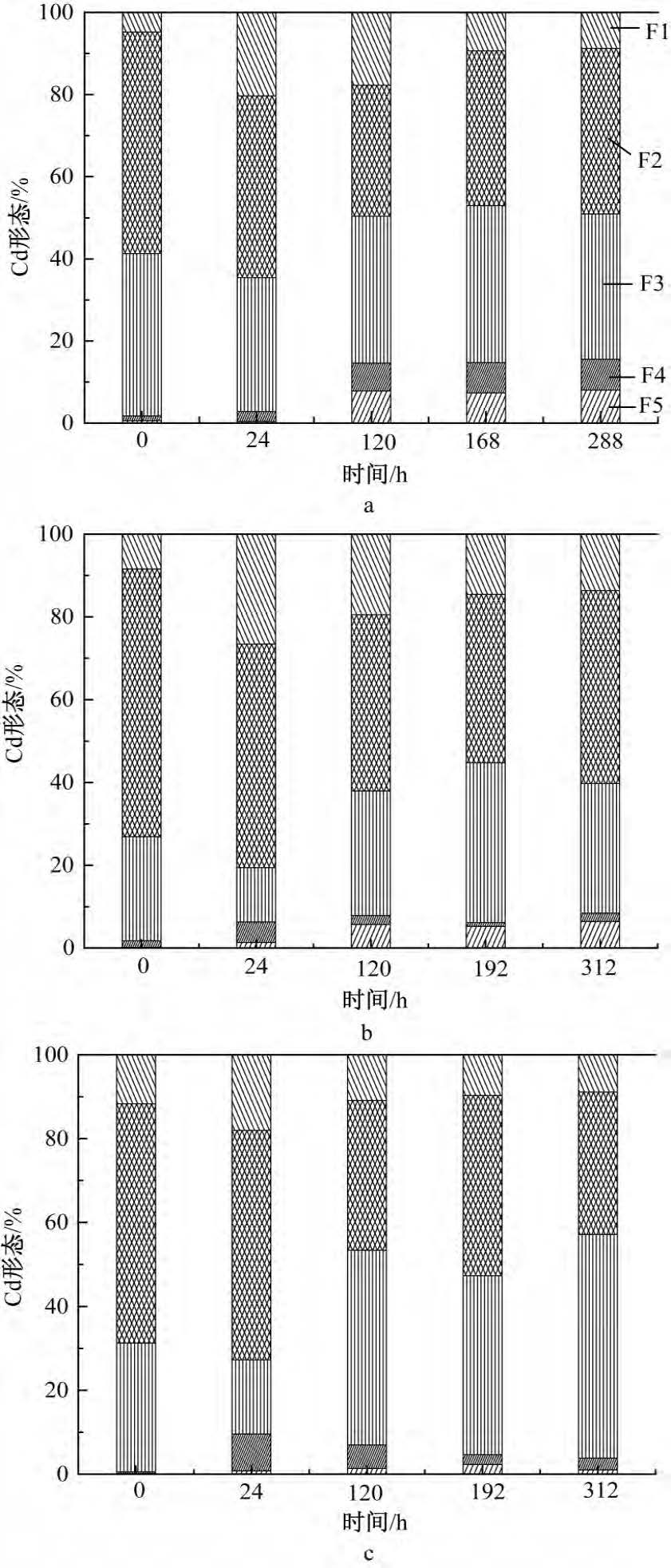 Cd形態的提取:在特定時間點將血清瓶中的樣品溶液離心,保存上清液測溶液中Cd2+,為F1態;再將離心得到的固體沉淀進行真空冷凍干燥得到固體粉末,采用連續提取法對體系固相中的Cd化學形態進行提取。具體提取步驟如下: